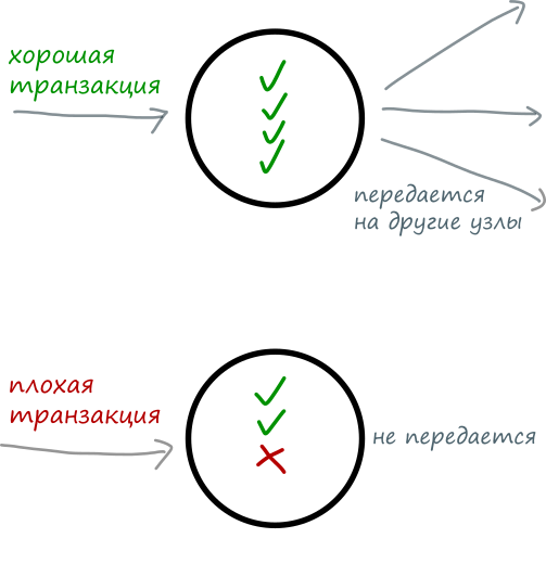 Каждый узел (биткоин-клиент) запрограммирован на выполнение набора правил. Следуя этим правилам, узел может проверять транзакции, которые он получает, и ретранслировать их, если с ними всё в порядке. При возникновении каких-либо проблем транзакция не передается далее в сеть Bitcoin.