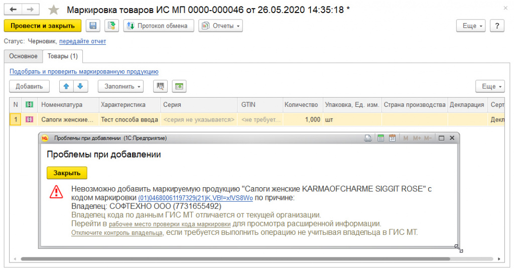 В программы 1С встроены проверки кодов маркировки, которые предоставляют пользователю информацию о текущем статусе и владельце кода маркировки непосредственно из программы.