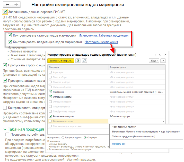 Для операций и товарных групп можно задать исключения. Ссылки для настройки исключений выводятся рядом с настройками Контролировать статусы кодов маркировки и Контролировать владельцев кодов маркировки при установке соответствующих флагов (см. рис. 1). После настройки исключений в ссылке указываются настроенные исключения.