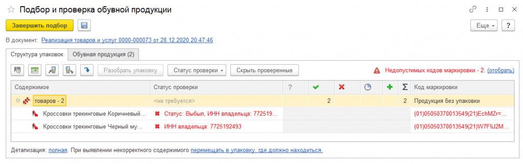 Если пользователь в ходе проверки кодов маркировки обнаружит некорректный для этой операции статус кода или принадлежность владельцу, в графе «Статус проверки» указывается результат этой проверки в виде «Статус:…» и/или «ИНН владельца…» с проставлением текущего (некорректного) статуса и/или владельца в информационной системе «Честный знак». Чтобы указать данный момент оператору, статус и код указываются красным.