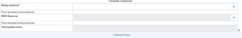 При необходимости ввода сведений по нескольким водителям, можно нажать на кнопку Добавится блок полей с новым перечнем полей по водителю для заполнения. Для удаления блока полей по водителю необходимо нажать на кнопку , расположенной справа от блока полей по водителю.