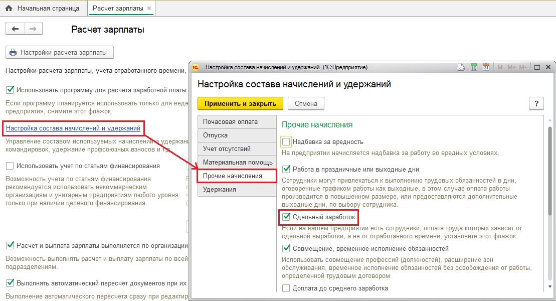В первую очередь следует заняться настройкой программы. Для этого отправьтесь в раздел «Настройка», далее в подраздел «Расчёт зарплаты». Здесь следует нажать на ссылку с надписью «Настройка состава начислений и удержаний», после чего откроется новое окно. В нём выберите пункт «Прочие начисления» и поставьте галочку в окошко рядом с надписью «Сдельный заработок»