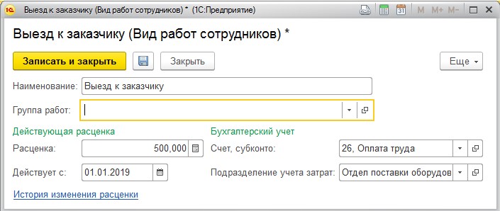 Изменённые настройки следует сохранить, нажав на «Применить и закрыть». После этого переходите к установке расценок: всё в том же разделе «Настройка» выберите «Виды работ». Нажмите на копку «Создать» и укажите все необходимые данные: наименование вида труда; дату, с которой начинается учёт; расценки. Часто нужно также указывать способ отражения в бухучёте и подразделение. Можно создать несколько видов работ с разными данными.