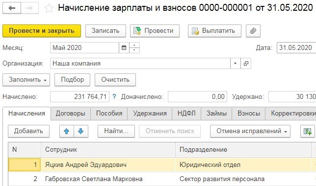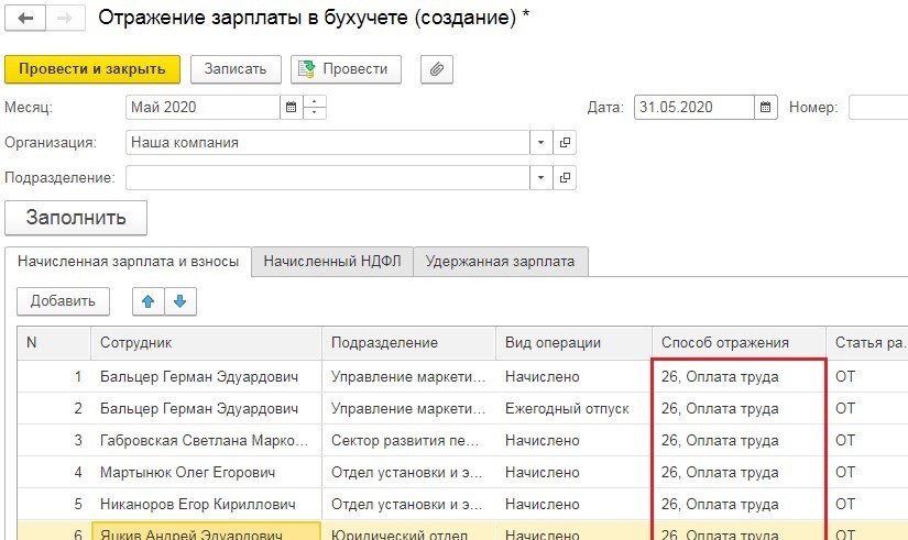 Когда будут внесены все изменения, нужно будет провести документ «Отражение зарплаты в бухучете». После чего проверить проводки.