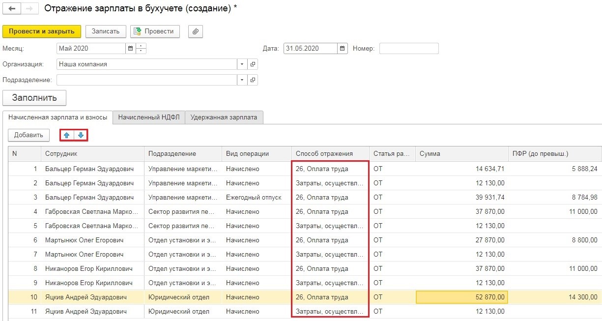 Чтобы откорректировать такое распределение, мы копируем строку сотрудника и добавляем в нее тот способ отражения в бухучете, который мы создали ранее.