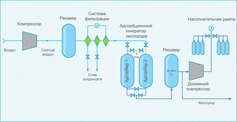 Схема работы адсорбционной кислородной установки и станции